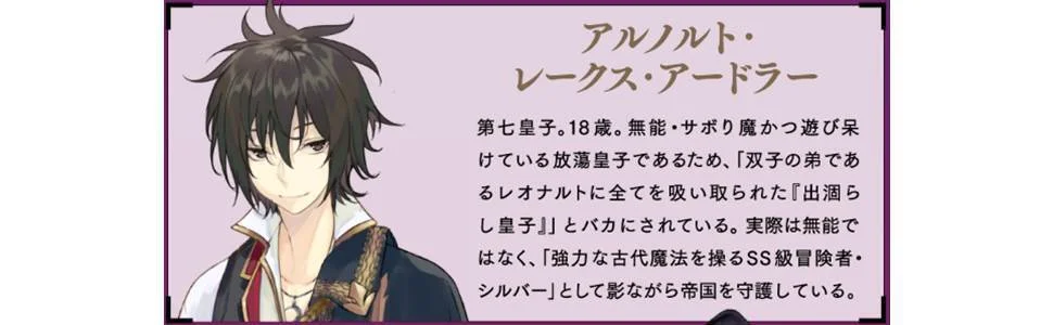 しかし実はアルノルトは、強力な「古代魔法」で高難易度の依頼をこなしている、仮面で顔を隠した凄腕のSSランク冒険者「シルバー」という裏の顔を持っている最強皇子であった。皇帝になる気のないアルノルトは、自分たちの命を守るため、皇帝に相応しいと思う弟のレオを皇帝にするべく、帝位争いをい影から支援しようと暗躍する。